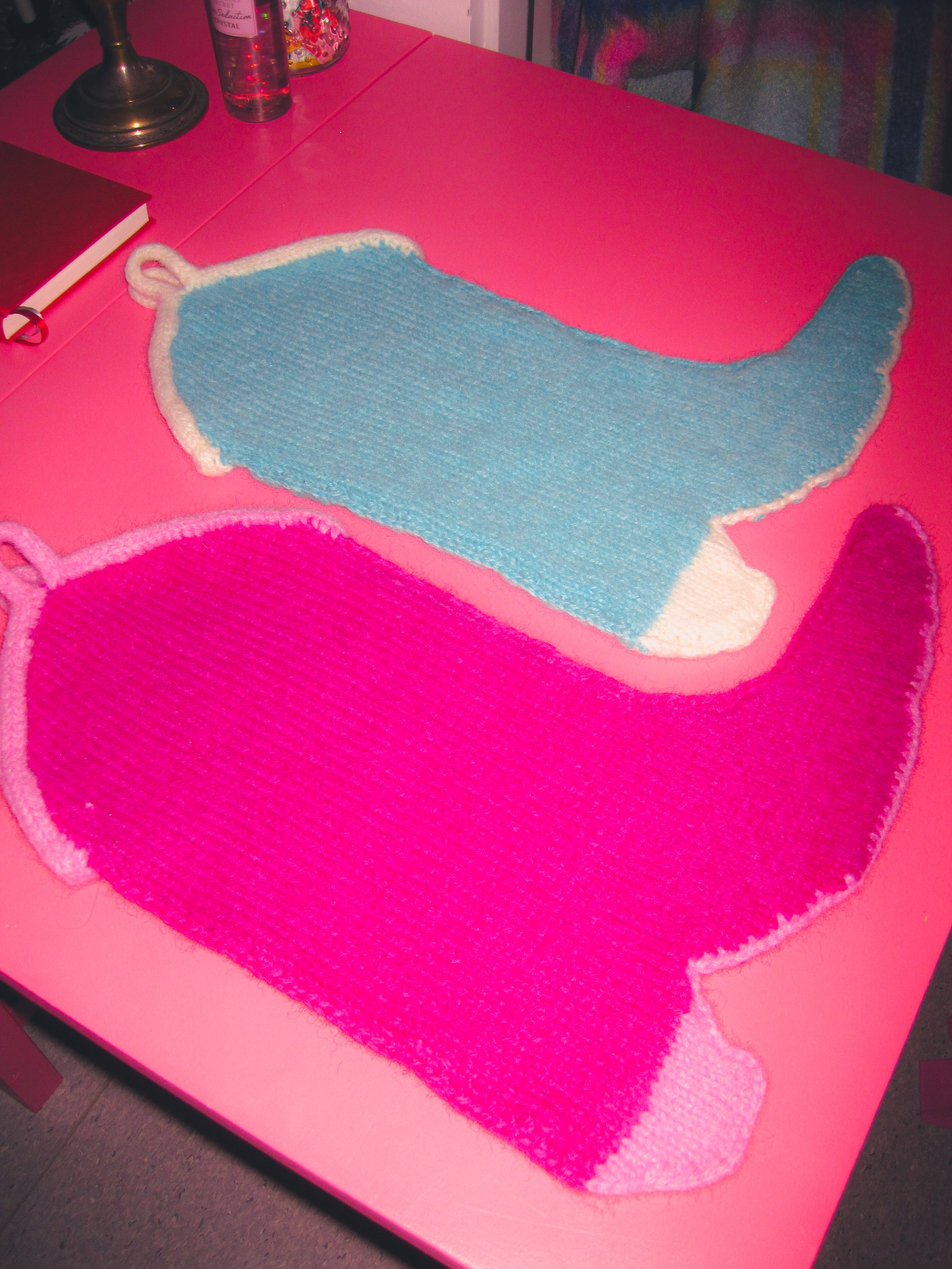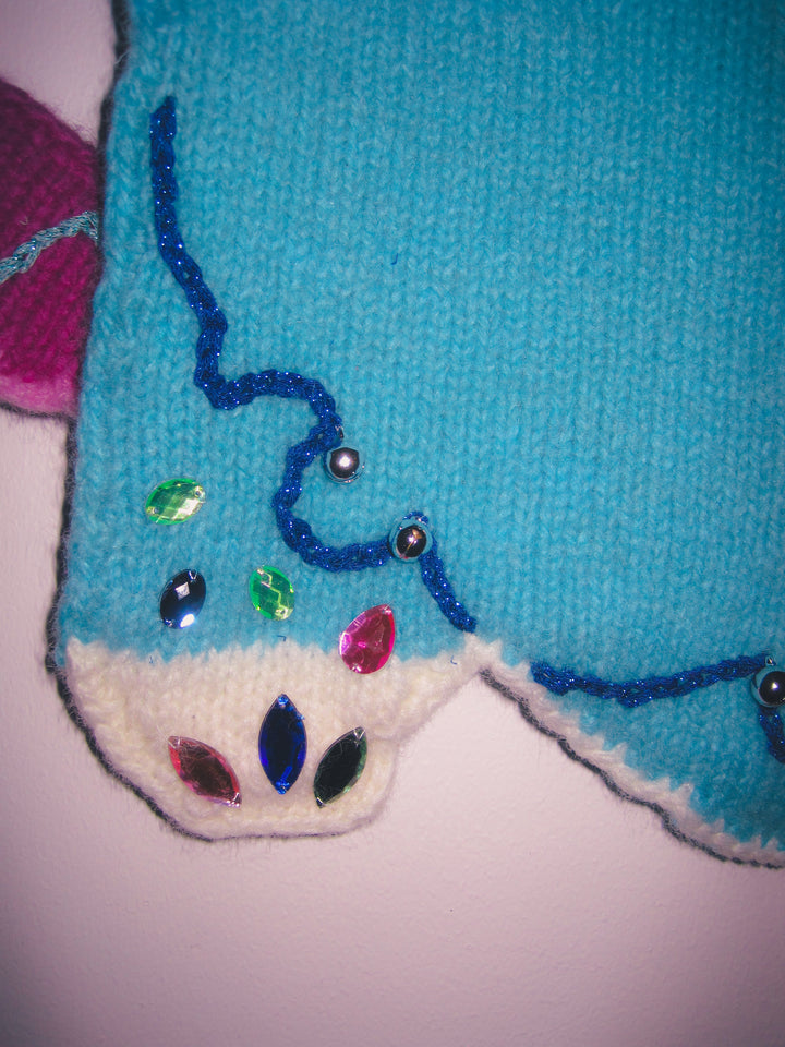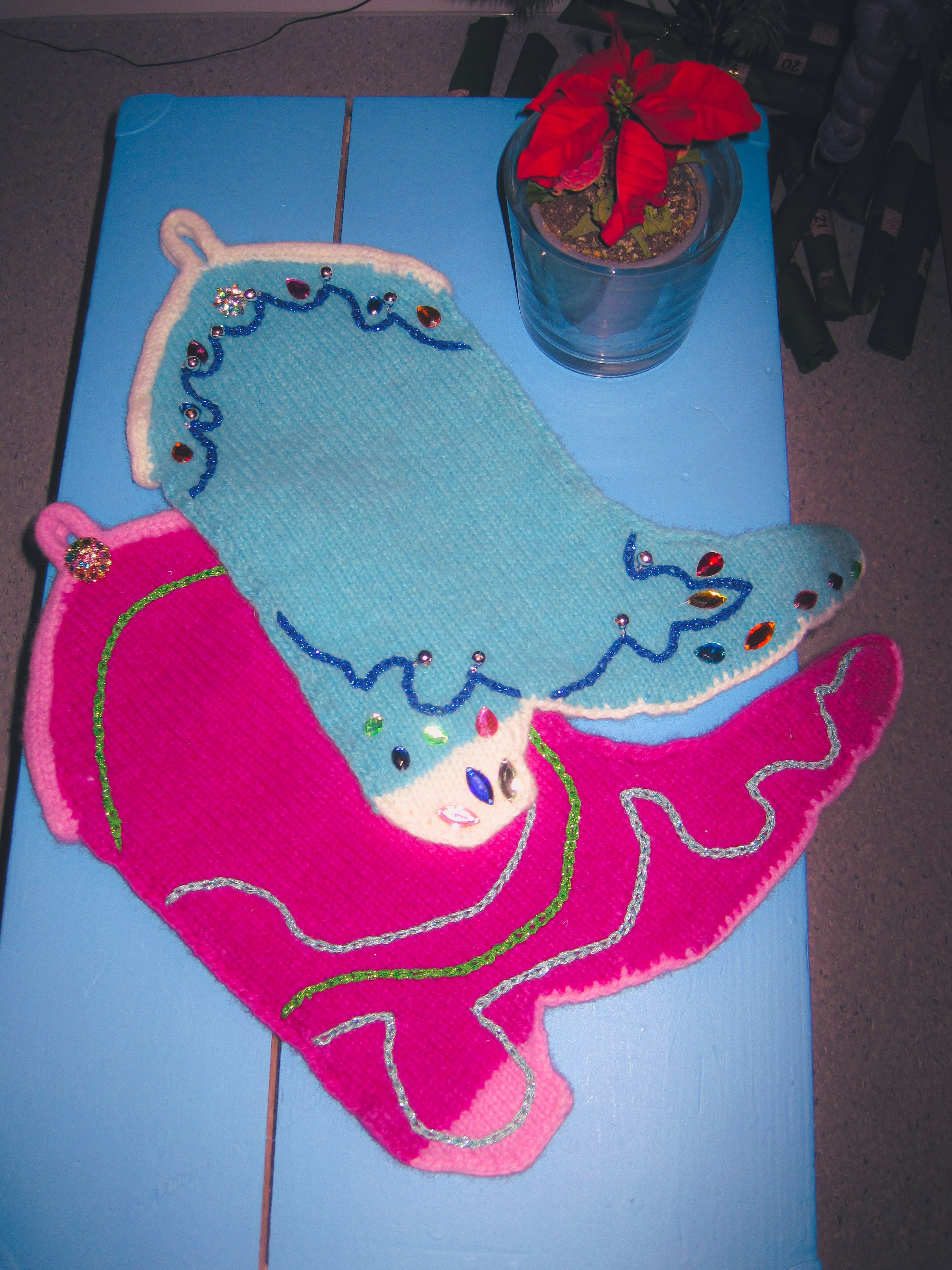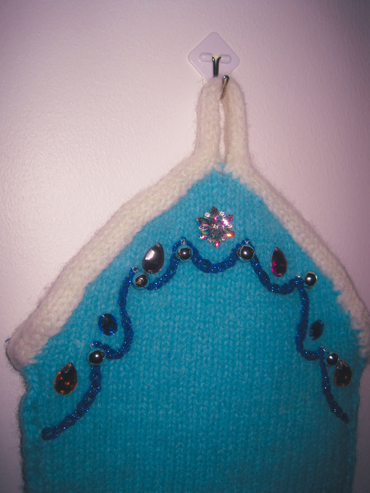 Mønster: Howdy Stocking hekles i to separate deler. Disse to hekles deretter sammen med staver før du strikker en icordkant oppå strømpen. Til slutt toves strømpen i vaskemaskin og pyntes med broderi, perler og paljetter.