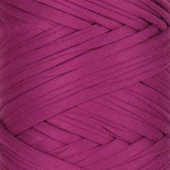 Gia T-SHIRT YARN is cut from fabric into bold, flat strands that create clean, graphic stitches with strong definition and a solid feel. It builds quickly on larger hooks, forming fabric that holds its shape and keeps its edge.