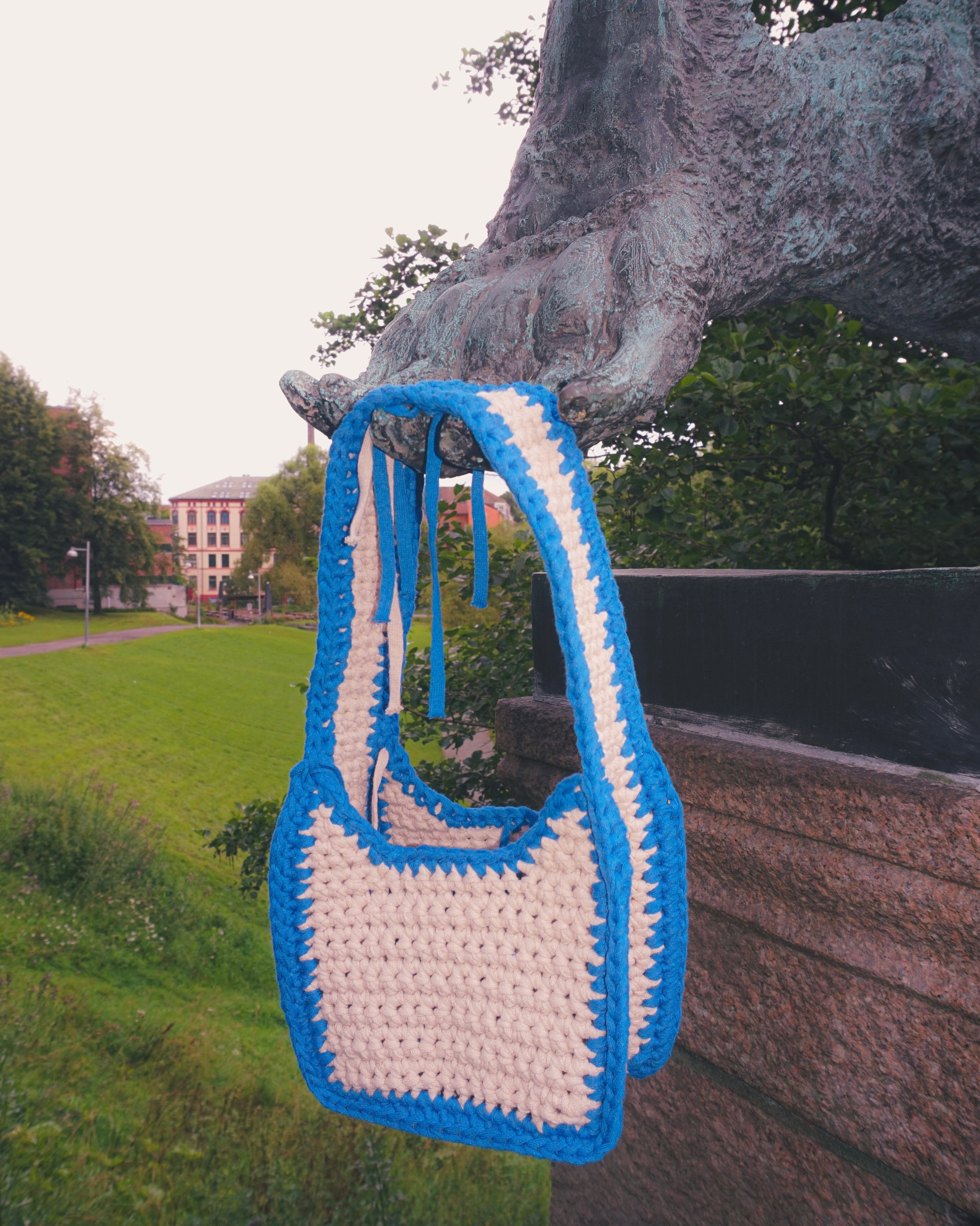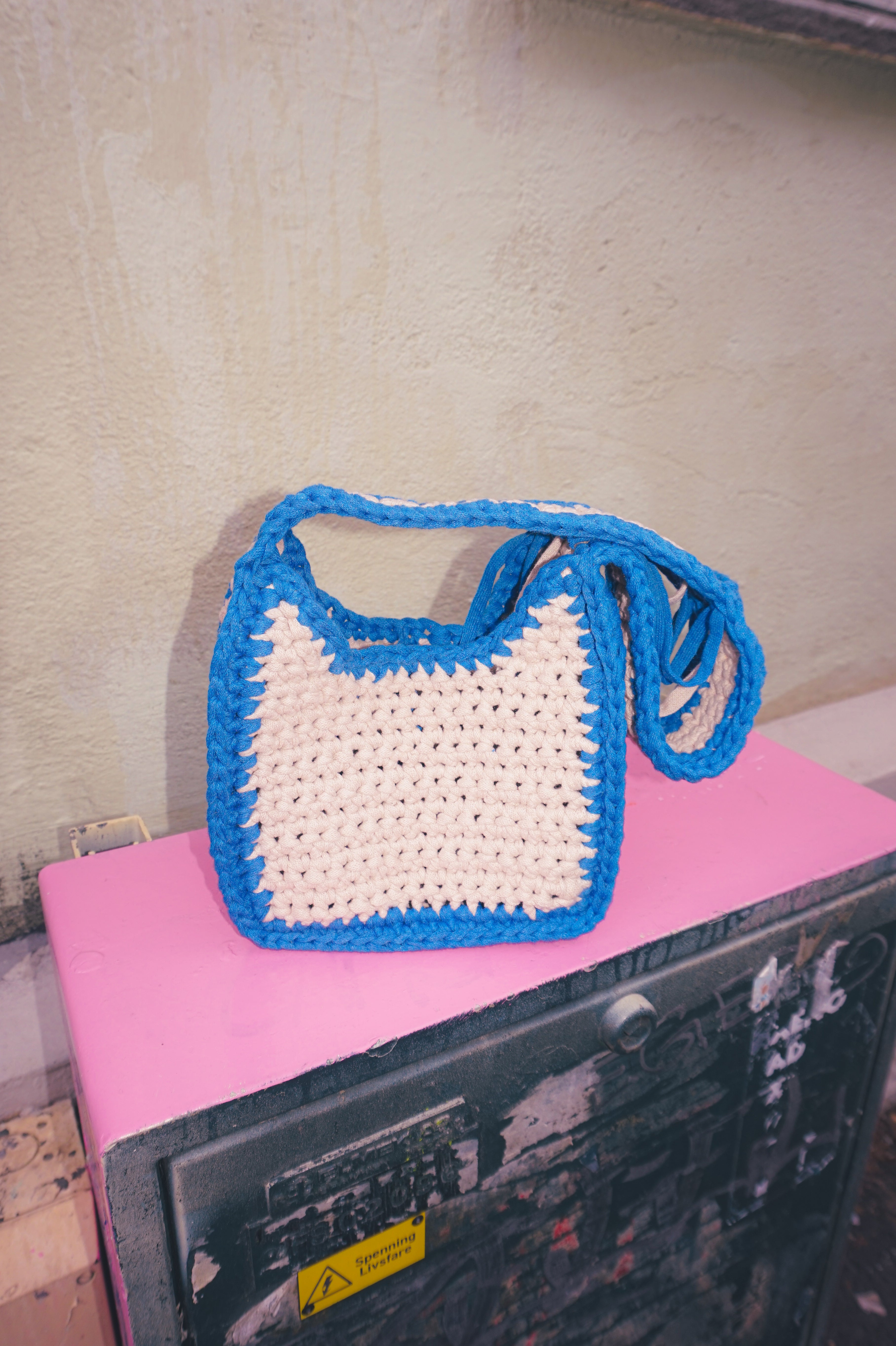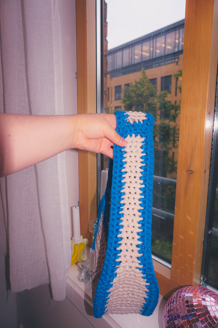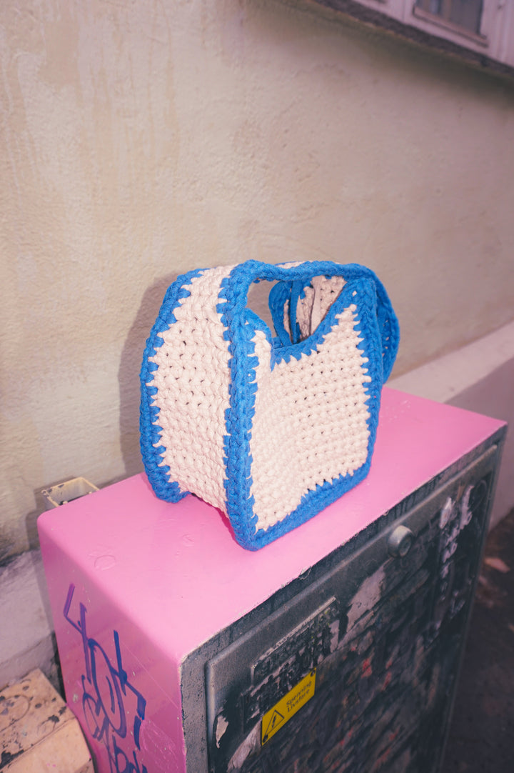 The individual pieces are joined together with a contrasting color, adding a modern touch and offering numerous possibilities for creative play. The crisp edges achieved through single crochet give the bag a clean finish. True to its name, the bag features a perfect square shape, making it a funky statement piece.