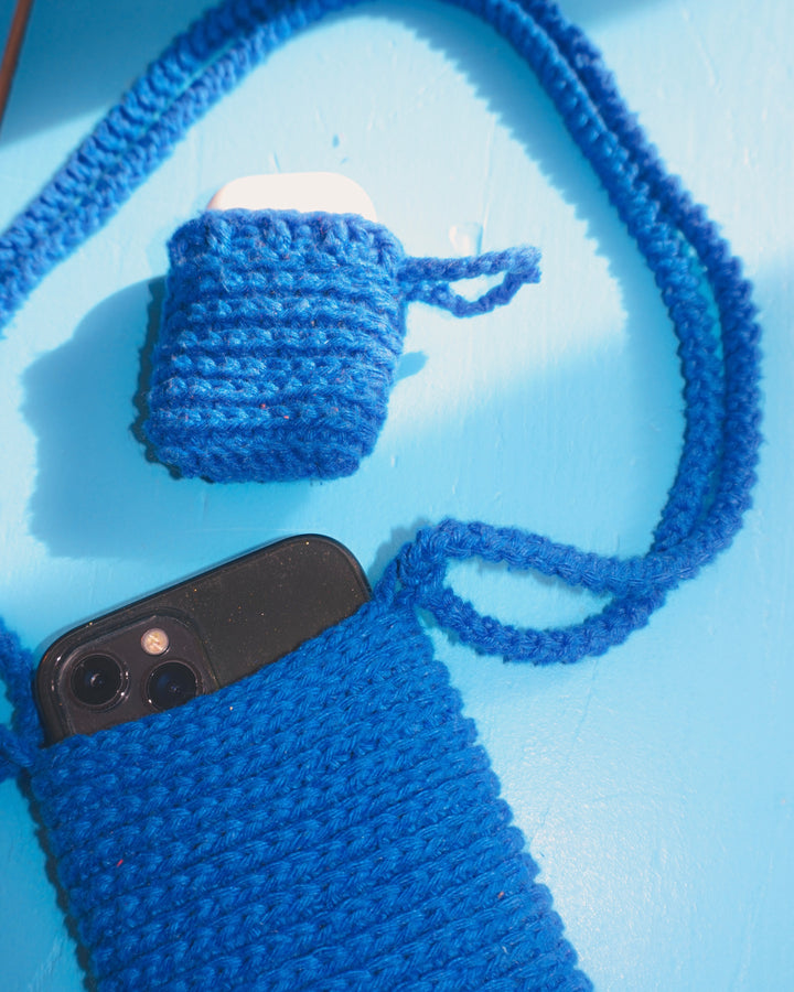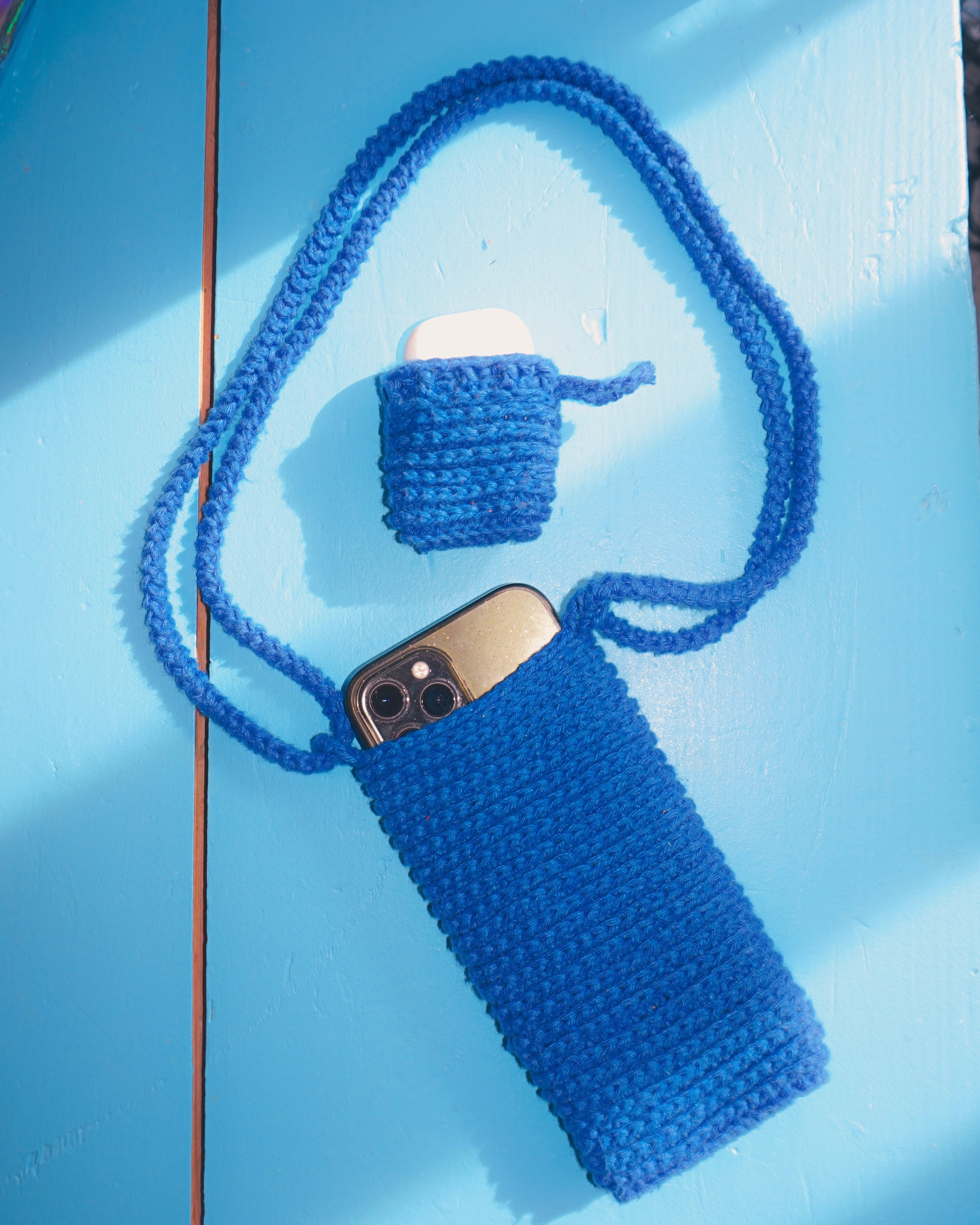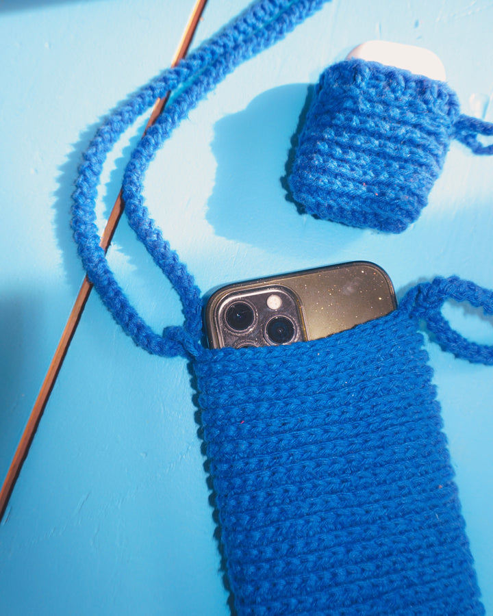 The phone pouch features a rope that can be held double for wearing around your neck or held single for a crossbody style.