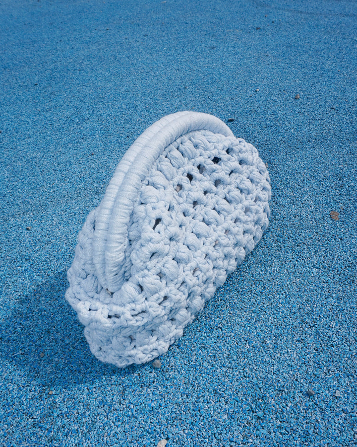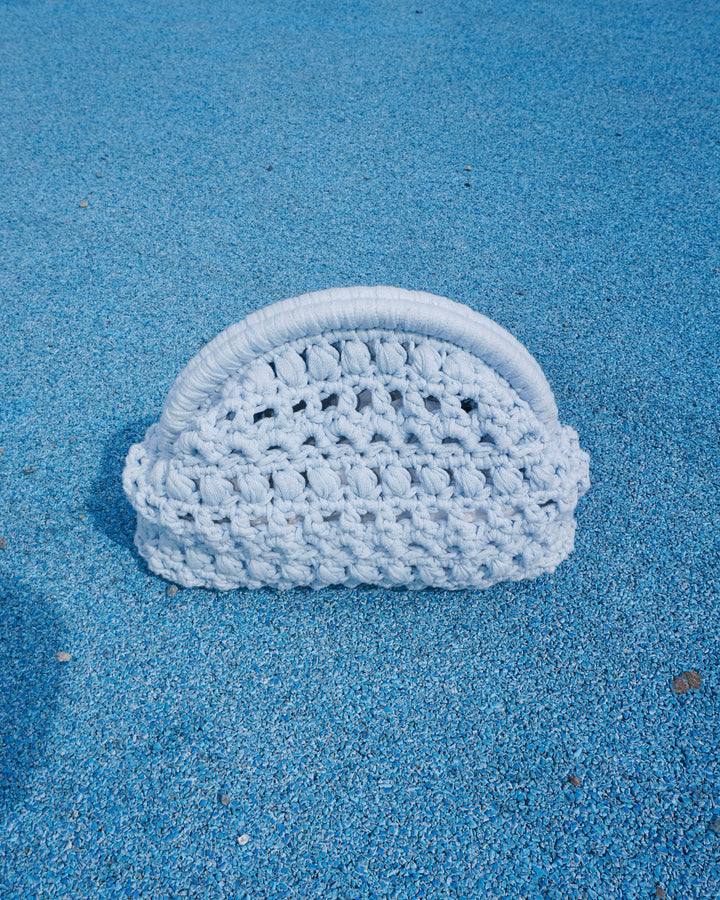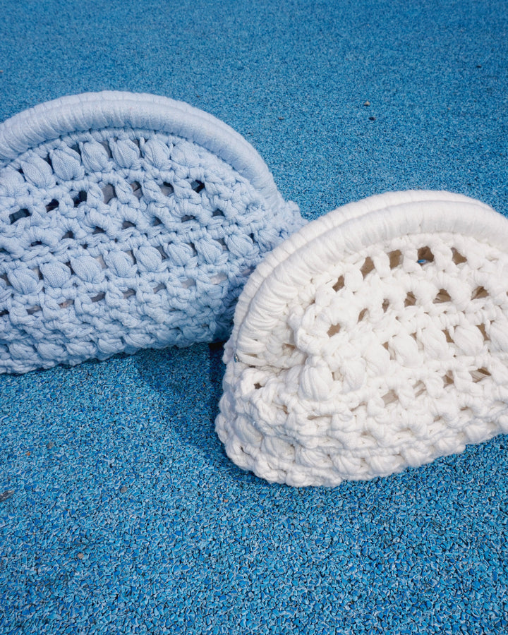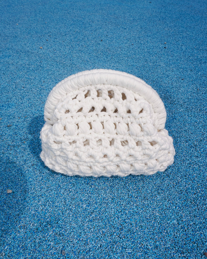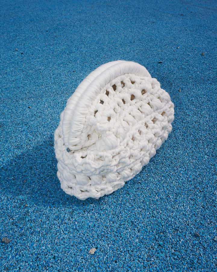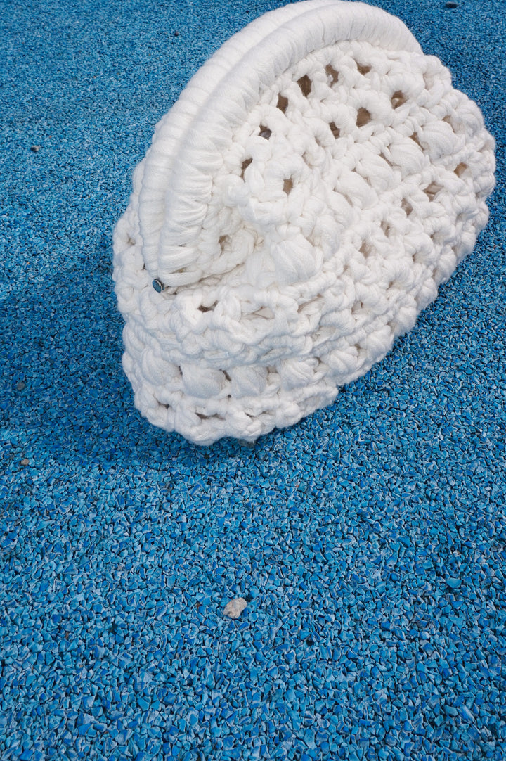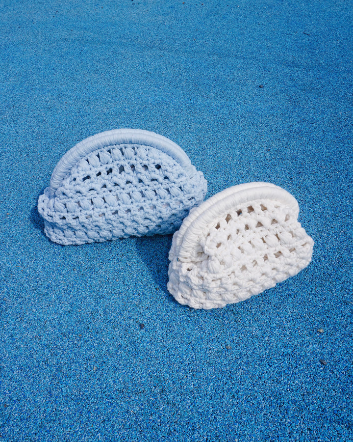 Meet your new go-to statement piece, the #DOECLUTCH. Crocheted bottom-up with chunky ribbon yarn, this clutch combines texture, structure, and a playful stitch pattern of chains, puffs, and half doubles. Finished with a metal frame for that crisp shape, it’s the perfect mix of handmade and polished.