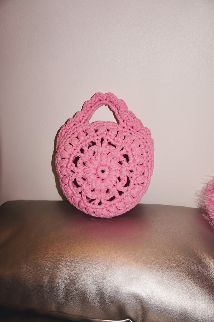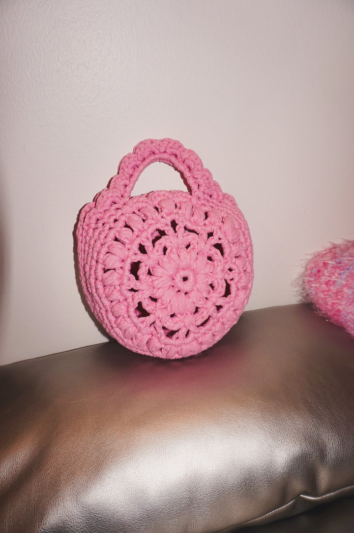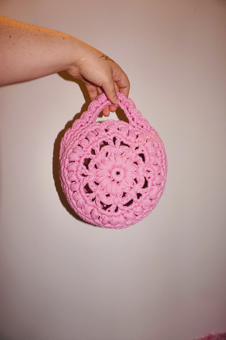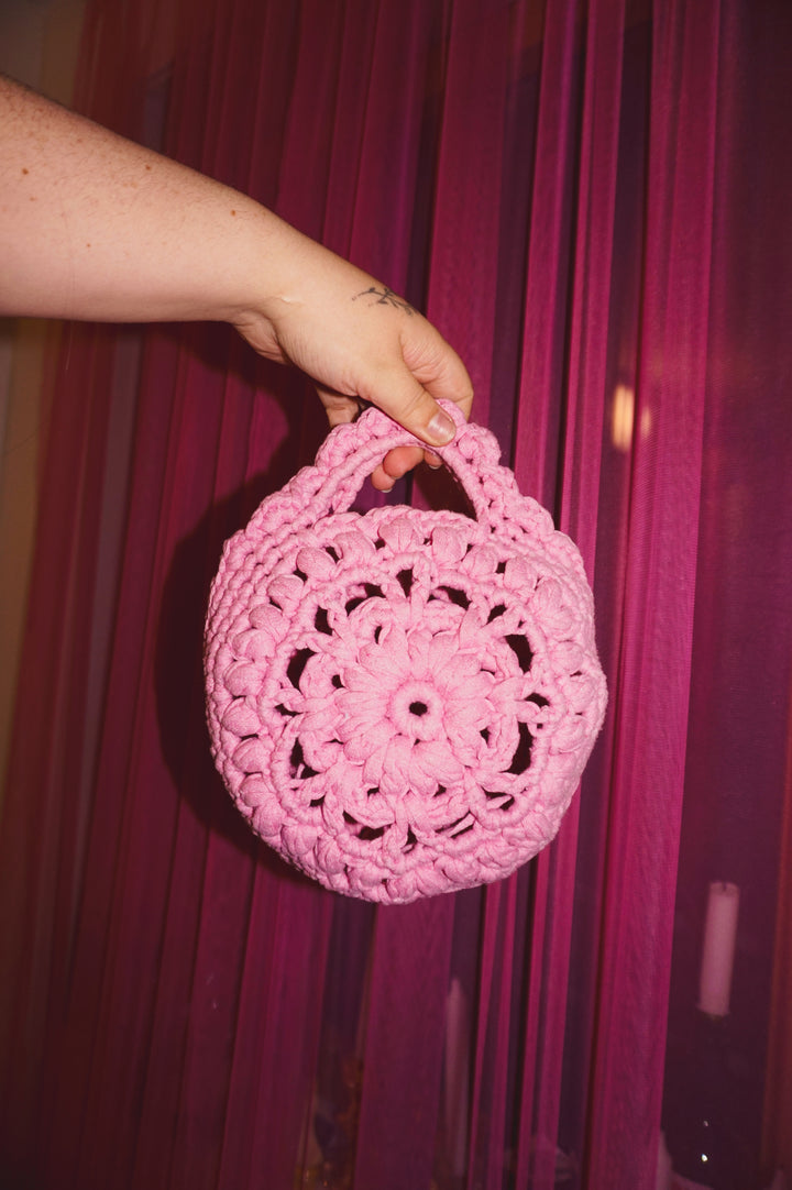 #DOILYBAG hekles rundt fra midten på siden og ut i 2 deler. Vesken hekles i et fyldig blomstermønster bestående av puffmasker, staver, fastmasker og luftmasker. Til slutt monteres begge sidene sammen med kjedemasker.