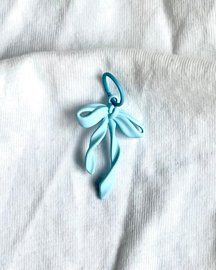 Sky Bow is a dreamy stitch marker in a gentle blue tone, shaped like a loosely tied ribbon drifting through a clear summer sky. Calm but playful, it adds a light, refreshing touch to your knitting - like a breath of fresh air mid-row.