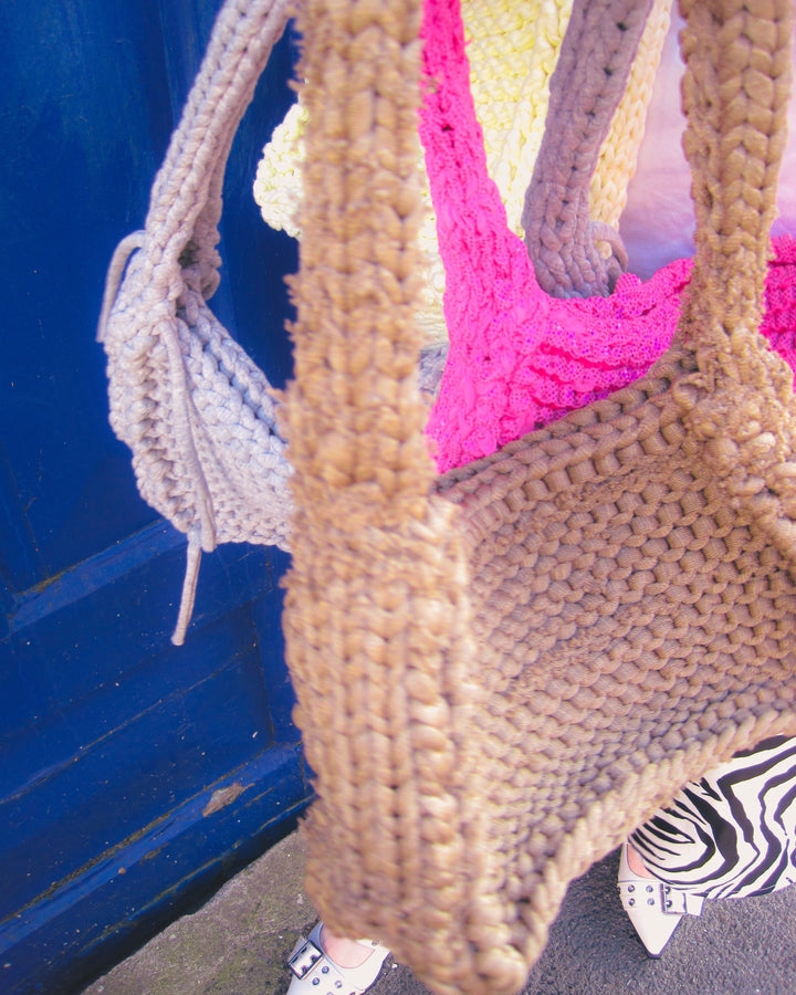 Designed with sustainability in mind, this pattern encourages using upcycled materials such as old duvet covers or fabric scraps for knitting. The bag is crafted in garter stitch, providing a stretchy and spacious design that's perfect for everyday use.